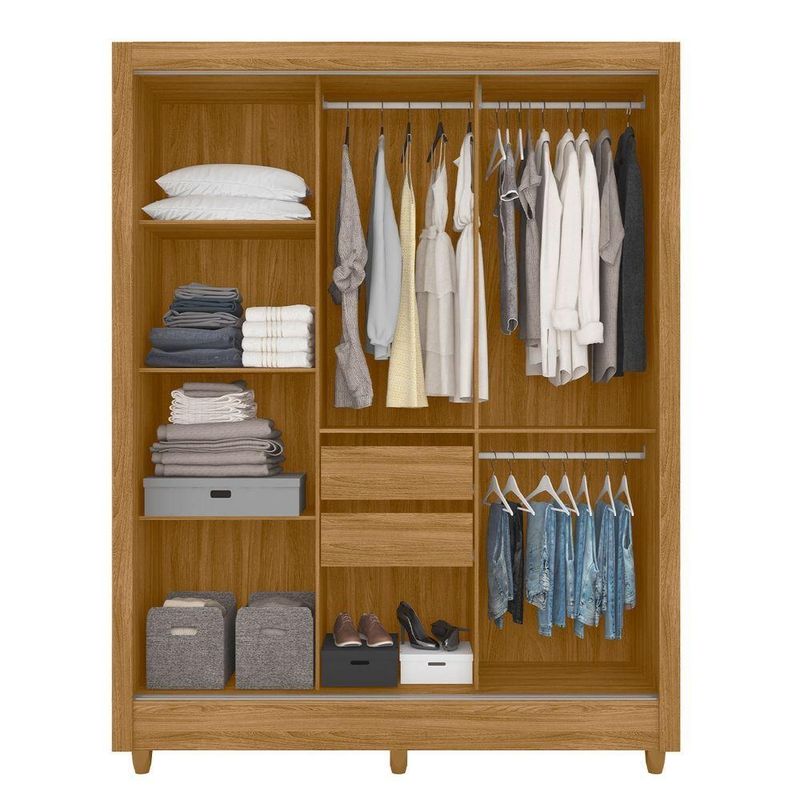 Com design funcional, o Guarda-Roupa Bolívia é perfeito para quem busca organização, espaço e estilo no quarto.O modelo conta com portas articuladas e gavetas inferiores, garantindo amplo espaço para armazenar roupas, calçados, acessórios e demais itens do dia a dia com praticidade.Seu interior é composto por prateleiras bem distribuídas e cabideiros metálicos resistentes, permitindo uma organização eficiente e acessível.A estrutura é fabricada em MDF/MDP de alta qualidade, com acabamento em pintura UV que proporciona durabilidade e um toque moderno ao visual do móvel.Dimensões:Altura: 211cmLargura: 164cmProfundidade: 53cmObservações:- Estrutura em MDF/MDP com pintura UV resistente e durável- Portas com dobradiças metálicas de alta qualidade- Gavetas com corrediças metálicas para abertura suave- Prateleiras internas e cabideiros para melhor organização- Visual moderno com puxadores discretos e acabamento clean