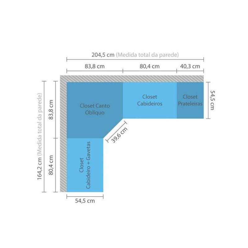*Dimensões do Roupeiro Closet Prime Canto Diagonal 83,8cm x 83,8cm, 1 Maleiro, 1 Cabideiro, 5 Prateleiras Luciane Móveis
