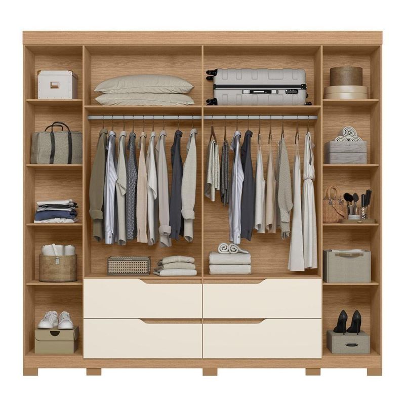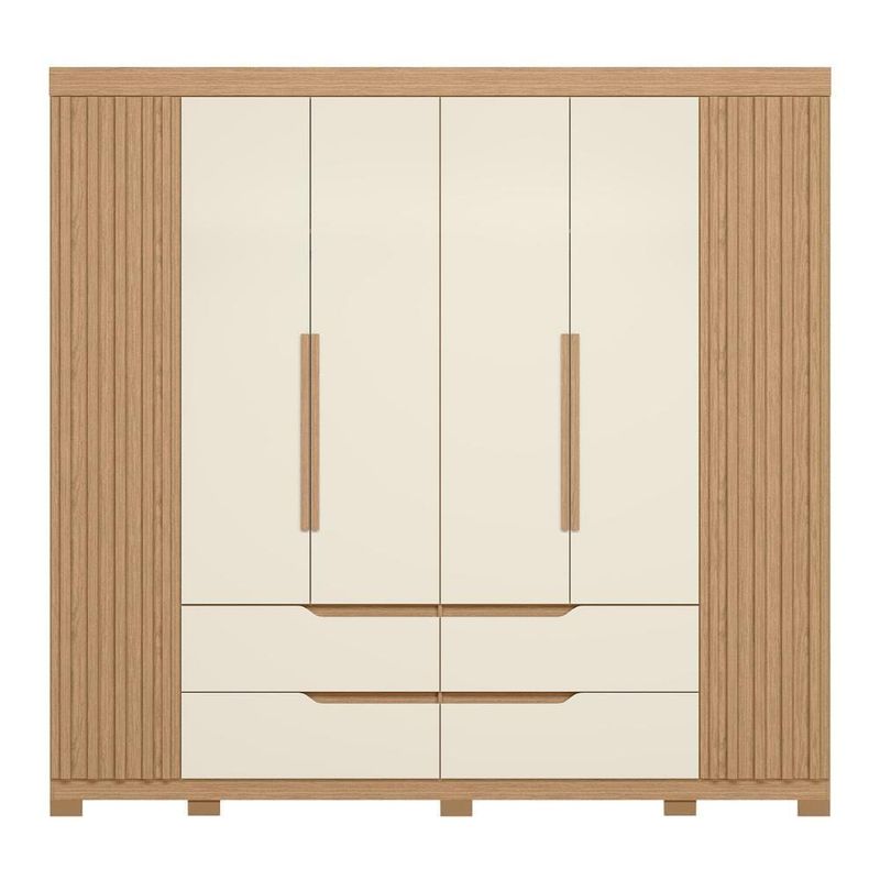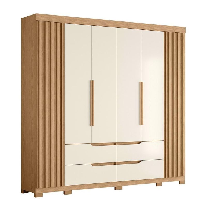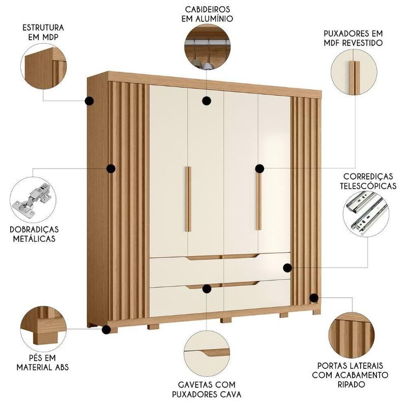 Esse Guarda Roupa Casal foi projetado com as portas laterais com detalhe ripado, que adicionam um toque de charme e estilo ao ambiente. Já as 4 gavetas espaçosas possuem puxadores estilo cava, proporcionando um visual moderno e sofisticado. Além disso, as corrediças telescópicas garantem um deslizamento suave e sem ruídos. Na parte interna, com os cabideiros em alumínio, você terá amplo espaço para pendurar suas roupas sem se preocupar com amassados, as diversas prateleiras são uma ótima opção para roupas que podem dobrar ou até mesmo para dispor calçados e bolsas. Outro detalhe são os pés, que oferecem estabilidade e durabilidade ao móvel, além de facilitar a limpeza do ambiente.