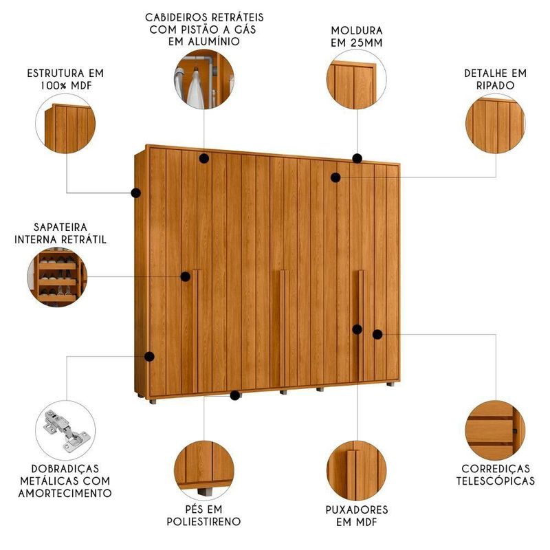 O grande diferencial desta peça está nas quatro sapateiras deslizantes com corrediças telescópicas, que oferecem organização adicional e fácil visualização dos calçados. As seis gavetas também com corrediças telescópicas garantem funcionalidade no dia a dia. Os pés em poliestireno asseguram estabilidade à estrutura. O guarda roupa se destaca pelo espaço generoso e pela elegância, ideal para o Quarto de Casal ou solteiro.