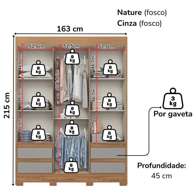 Guarda Roupa Casal 3 Portas 4 Gavetas 163 Cm B55 Nature Cinza Briz