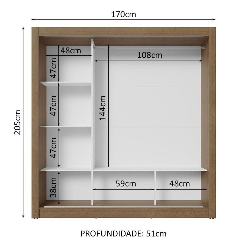 Medidas totais: 205 cm de altura x 170 cm de largura x 51 cm de profundidade.