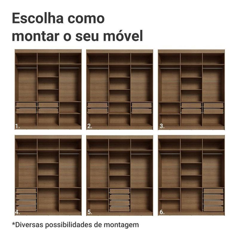 As portas fecham de forma suave e silenciosa, por possuir dobradiças com amortecimento. As gavetas permitem uma abertura completa e o amplo maleiro é perfeito para armazenar itens maiores. O interior do guarda-roupa pode ser personalizado, com a possibilidade de ajustar as gavetas e prateleiras conforme suas necessidades.