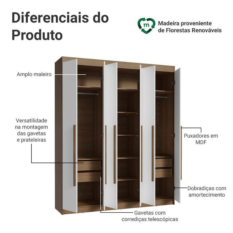 Possui uma pintura de alta resistência, que garante durabilidade e um acabamento impecável por muito mais tempo. A estrutura e os puxadores são em tom amadeirado Rustic e as portas na cor branca, criando um visual sofisticado que se adapta a qualquer estilo de decoração. Os puxadores de 80 cm, fabricados em MDF, são um dos grandes diferenciais, trazendo um design alongado e moderno.