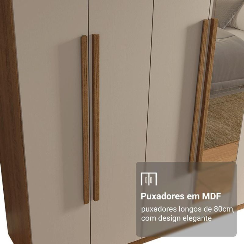 Possui uma pintura de alta resistência, que garante durabilidade e um acabamento impecável por muito mais tempo. A estrutura e os puxadores são em tom amadeirado Rustic e as portas na cor Crema, criando um visual sofisticado que se adapta a qualquer estilo de decoração. Os puxadores de 80 cm, fabricados em MDF, são um dos grandes diferenciais, trazendo um design alongado e moderno.