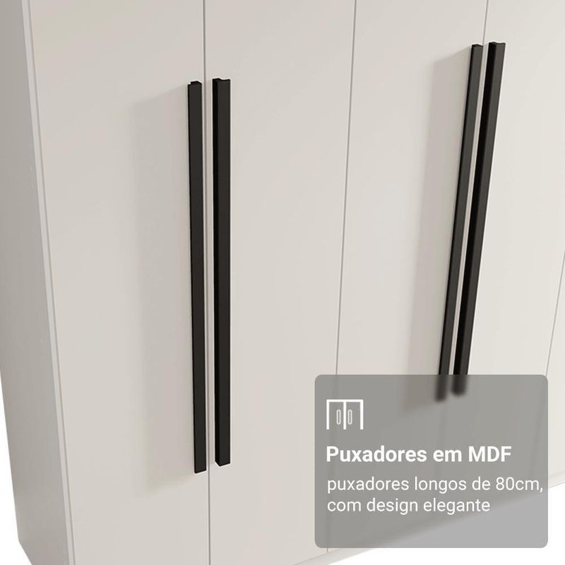 Possui uma pintura de alta resistência, que garante durabilidade e um acabamento impecável por muito mais tempo. A estrutura e as portas são na cor Branca e os puxadores em Preto, criando um visual sofisticado que se adapta a qualquer estilo de decoração. Os puxadores de 80 cm, fabricados em MDF, são um dos grandes diferenciais, trazendo um design alongado e moderno.