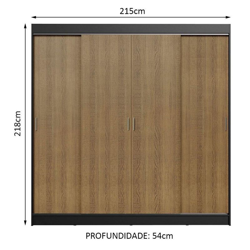 Medidas totais do guarda-roupa: 218 cm de altura x 215 cm de largura x 54 cm de profundidade.