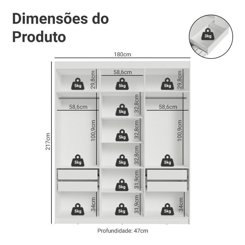 O Guarda-Roupa Venus oferece versatilidade para organizar seu espaço da melhor forma. Com dobradiças com amortecimento, as portas fecham suavemente. As gavetas com corrediças telescópicas permitem abertura total, enquanto o amplo maleiro é perfeito para itens maiores. Além disso, você pode ajustar as gavetas e prateleiras para personalizar o interior conforme suas necessidades. As portas do meio possuem espelho, agregando ainda mais funcionalidade e sofisticação ao móvel.