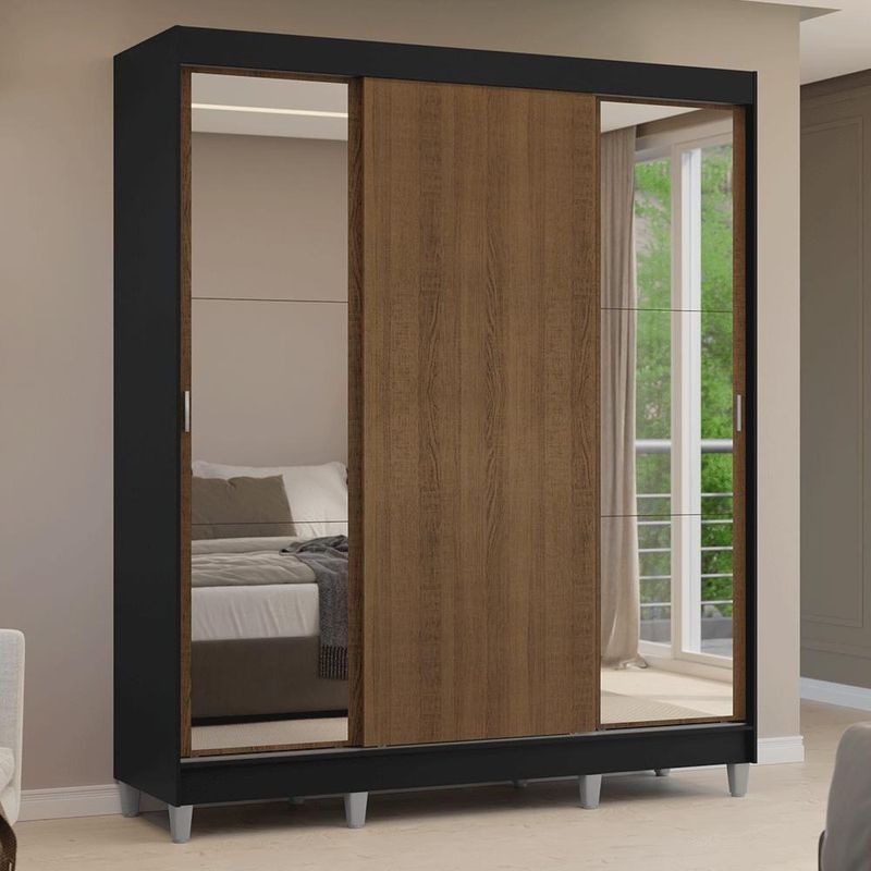 Guarda-roupa Casal Com Pés 3 Portas De Correr Com Espelhos Preto/rustic Reno Madesa Preto/rustic