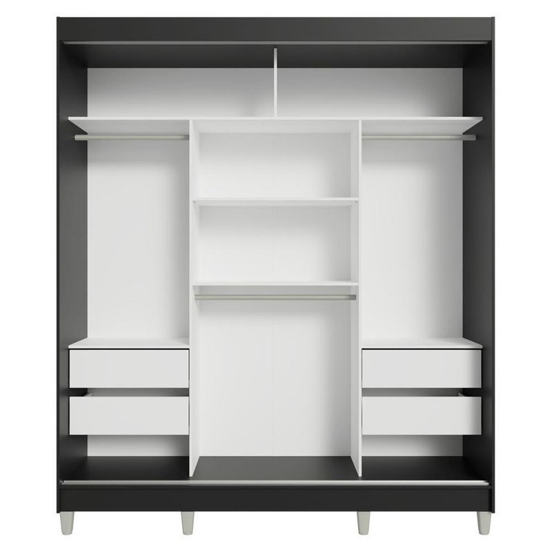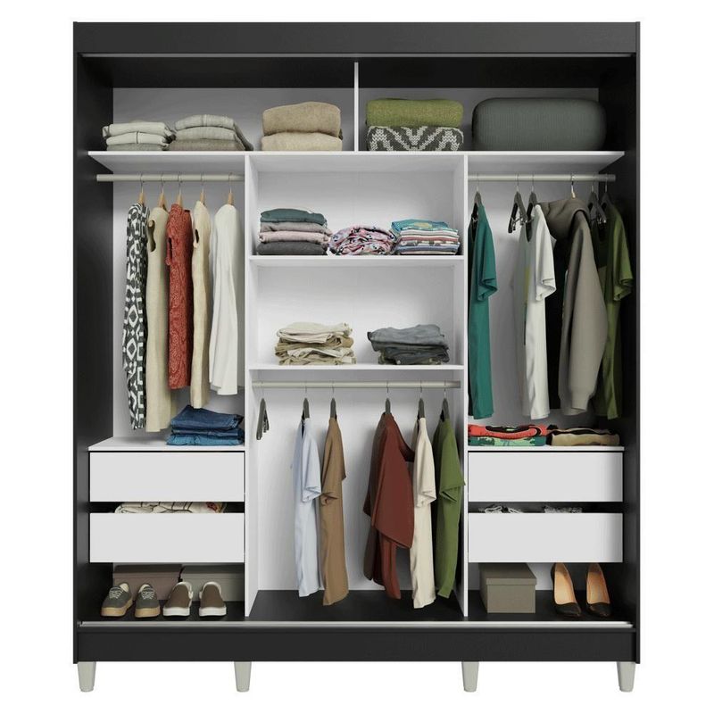 Essa versão possui três portas de correr, sendo duas com espelhos, que trazem mais praticidade no dia a dia. Os trilhos de alumínio garantem deslizamento suave e silencioso, otimizando o espaço do quarto. Por dentro, o guarda-roupa oferece quatro gavetas espaçosas com corrediças metálicas e três cabideiros, proporcionando espaço ideal para roupas, acessórios, malas e outros itens, mantendo tudo sempre organizado.