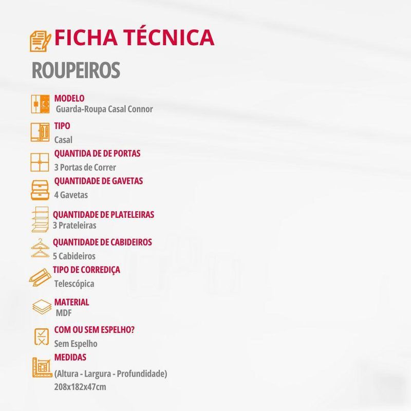 Guarda-roupa Connor 100 MDF 3 portas de correr 4 Gavetas