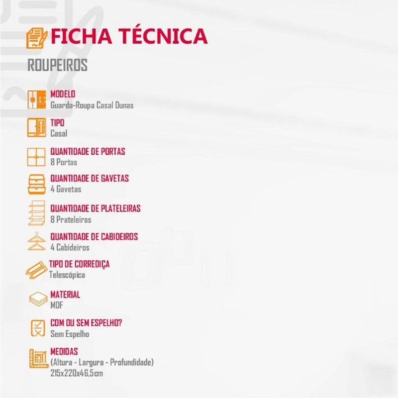 Guarda Roupa Casal Dunas com 8 Portas e 4 Gavetas MDF Moderna