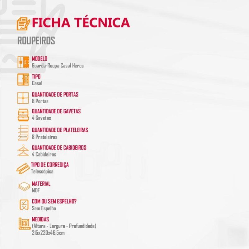 O Guarda-Roupa Heros e a combinacao perfeita de espaco e sofisticacao. Produzido em 100 MDF, ele oferece um design minimalista com um toque de requinte que se adapta a seu ambiente. Com 8 portas, 4 gavetas e 4 cabideiros, sua ampla e bem estruturada divisao interna garante a organizacao ideal para seus pertences. O Heros nao so otimiza sua rotina, mas tambem traz uma sensacao de harmonia e elegancia ao seu lar, elevando o padrao de conforto e funcionalidade no dia a dia.