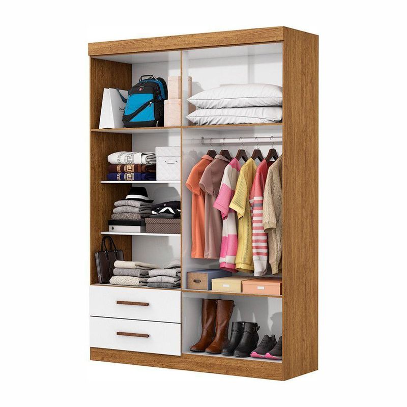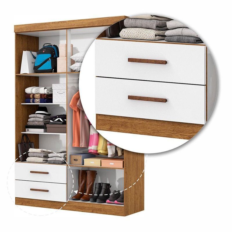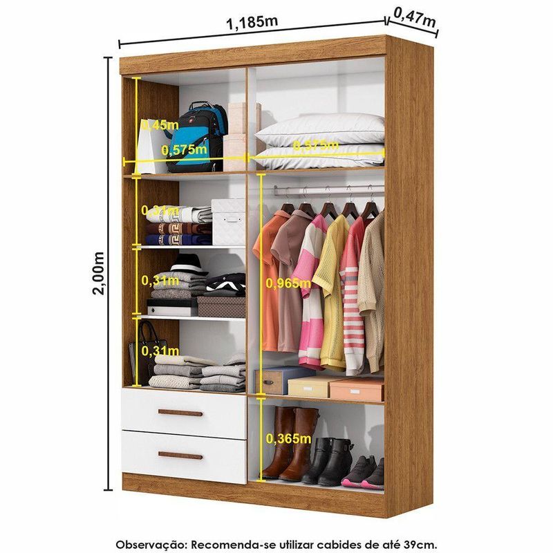 A linha Lu e ideal para quem procura um produto compacto e funcional. Possui 2,00m de altura, 1,185m de largura e 0,47m de profundidade combinado com 2 gavetas, 2 prateleiras e um grande cabideiro, deixando o produto com uma otima divisao interna. O maleiro e ideal para guardar malas, cobertores, edredons. O cabideiro alem de resistente, e ideal para pendurar pares de blusas, camisas acessorios. As prateleiras sao perfeitas para colocar roupas como blusas, shorts, regatas, kits de maquiagem, toalhas, caixinhas com acessorios e bolsas menores. As gavetas fixadas sobre corredicas metalicas, sao ideais para guardas blusas dobradas, shorts, malhas e roupas intimas. Estrutura do produto em MDP.