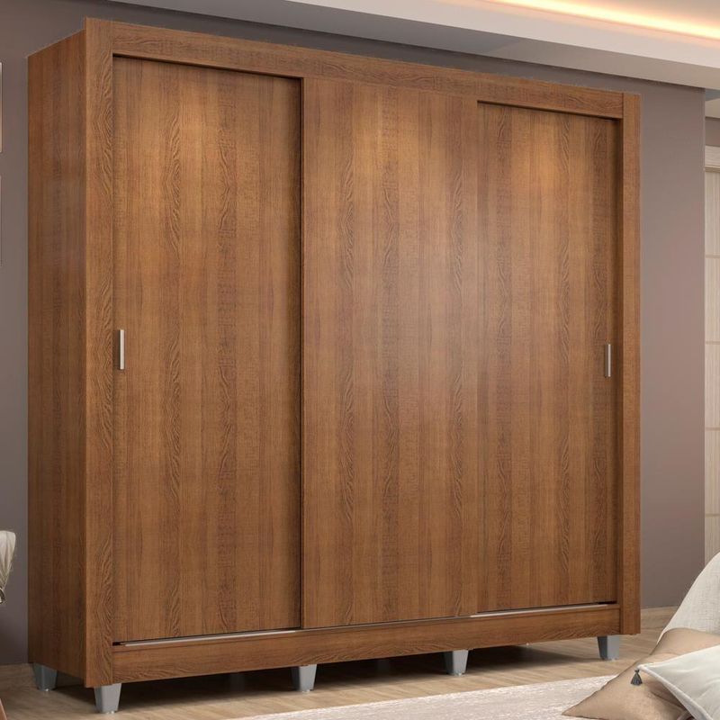 - Itens inclusos: 3 prateleiras totalizando 5 nichos, 2 gavetas internas, 1 cabideiro grande, 3 portas de correr de madeira com 2 puxadores em PVC, 1 Kit com 8 pés em PVC