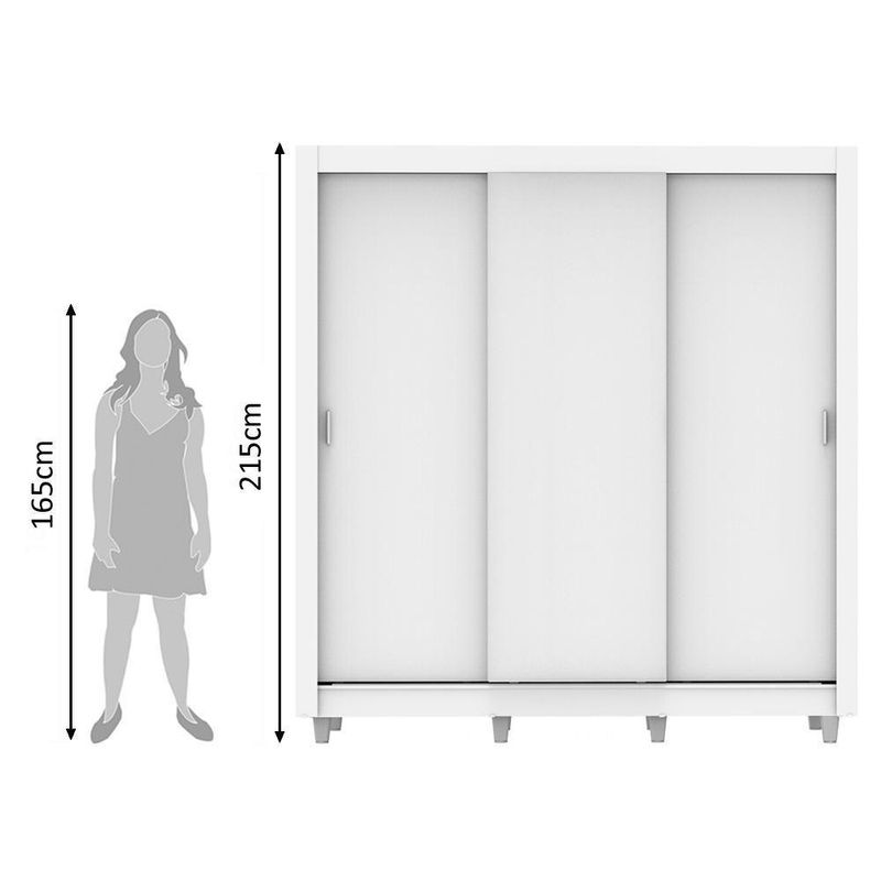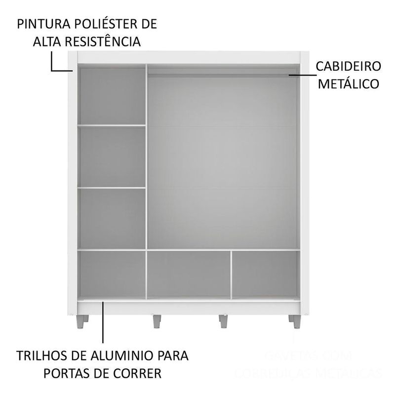 - Itens inclusos: 3 prateleiras totalizando seis 6 nichos; 1 cabideiro grande, 3 portas de correr de madeira com 2 puxadores em PVC