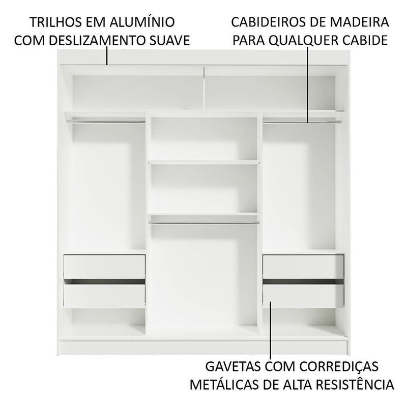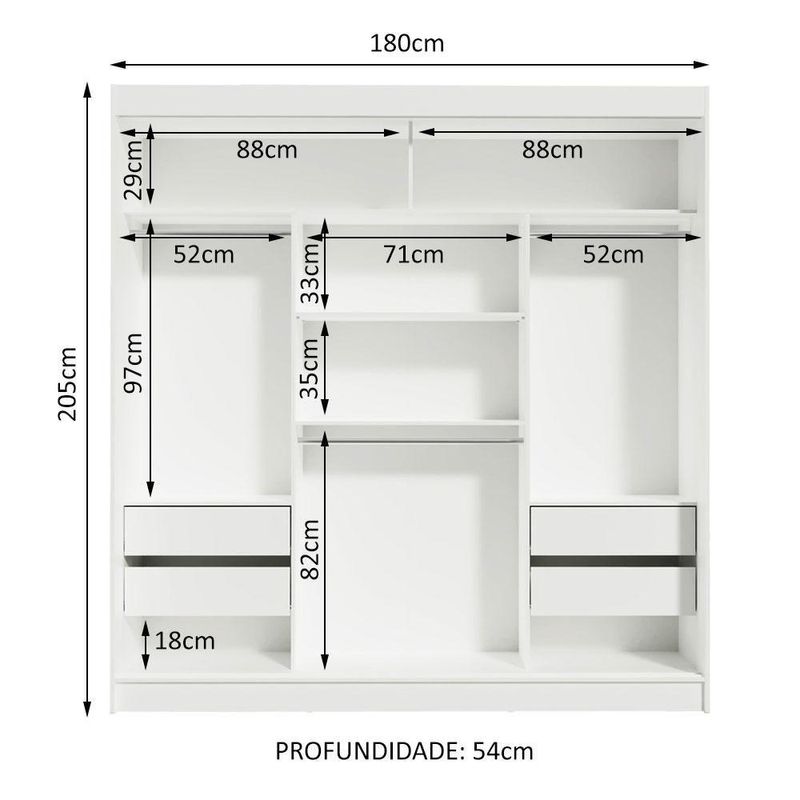 Para completar, o acabamento é branco, feito em Pintura Poliéster de alta resistência. Um método ecológico e que proporciona maior durabilidade ao produto.Medidas totais do guarda-roupa: 205 cm de altura x 180 cm de largura x 54 cm de profundidade.