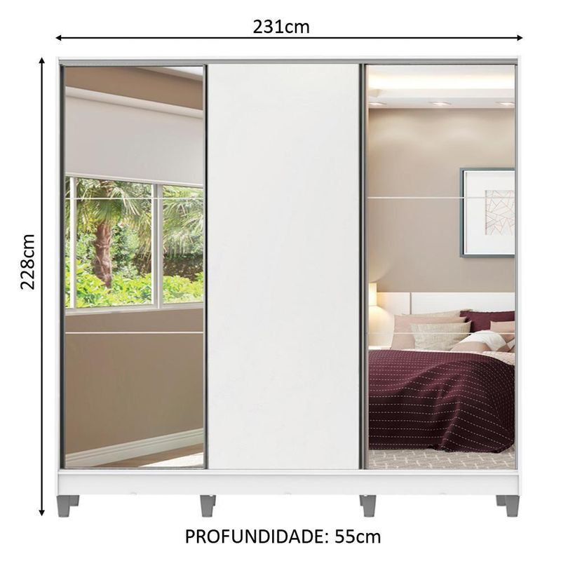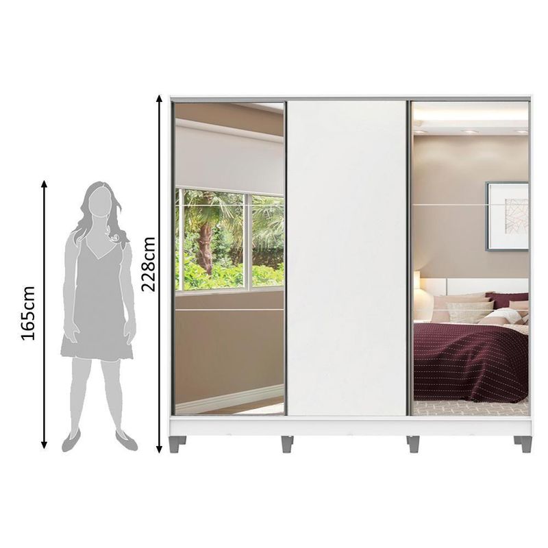 - Itens inclusos: 3 cabideiros | 4 gavetas internas | 8 prateleiras | 3 portas de correr, apresentando sistema anti-descarrilhamento, sendo uma de madeira e duas com espelhos