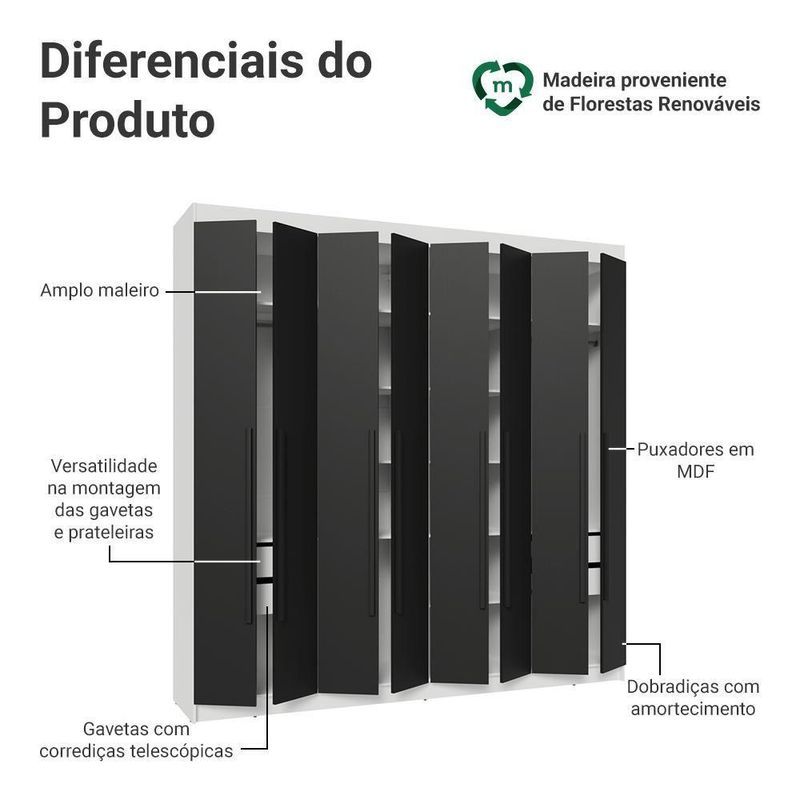 Possui uma pintura de alta resistência, que garante durabilidade e um acabamento impecável por muito mais tempo. A estrutura é na cor Branca, as portas e puxadores em Preto, criando um visual sofisticado que se adapta a qualquer estilo de decoração. Os puxadores de 80 cm, fabricados em MDF, são um dos grandes diferenciais, trazendo um design alongado e moderno.
