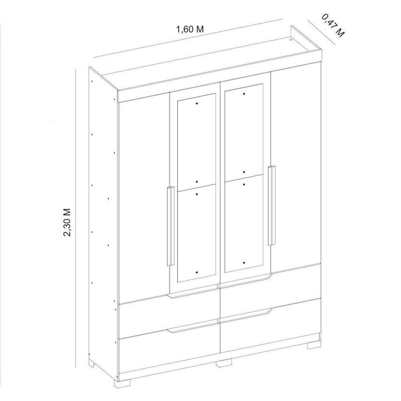 Com design imponente e funcional, o Guarda-Roupa Doble é perfeito para quem valoriza elegância e amplo espaço interno.Conta com 4 portas e 4 gavetas, além de cabideiros em alumínio, que proporcionam excelente capacidade de organização para roupas longas, dobradas e acessórios.As gavetas com corrediças telescópicas garantem deslizamento suave, enquanto os puxadores usinados e o acabamento refinado trazem um visual sofisticado ao ambiente.O modelo ainda conta com pés inclusos que elevam o móvel e facilitam a limpeza, além do acabamento em pintura UV, que realça as cores e aumenta a durabilidade da peça.Dimensões:Altura: 230 cmLargura: 160 cmProfundidade: 47 cmObservações:- 4 portas e 4 gavetas com amplo espaço interno- Gavetas com corrediças telescópicas e puxadores usinados- Cabideiros em alumínio e estrutura firme- Pés inclusos para estabilidade e praticidade- Acabamento em pintura UV com visual sofisticado