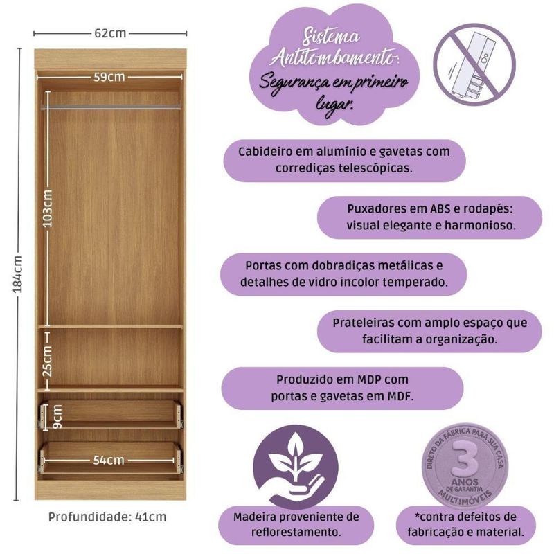 - Detalhes de vidro incolor temperado 3mm nas portas: toque charmoso que permite visualizar o interior do móvel.