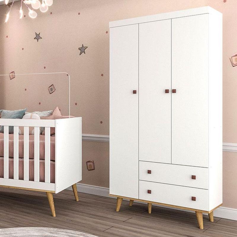 Guarda Roupa Infantil Retrô Fernanda 3 Portas Branco Acetinado Bétula - CarolinaChegou a hora de escolher o guarda roupa ideal para o quartinho do seu pequeno mamãe, apresentamos essa linda e especial opção da linha Fernanda desenvolvida com todo amor, cuidado e carinho para vocês, o Guarda Roupa 3 Portas e 2 Gavetas foi desenvolvido com materiais de excelentes qualidades para maior durabilidade e resistência do móvel, conta com amplo espaço interno e ótimas repartições para maior praticidade no seu dia a dia e organização das roupinhas e acessórios do seu baby, sistema de travas Anti-Tombamento fixada na parede para maior segurança de todos e prevenção de acidentes, possui um lindo e delicado design na cor Branco Acetinado com pés em madeira maciça na cor Bétula proporcionando modernidade, tranquilidade e conforto ao ambiente. Não deixe de aproveitar e garantir o seu, você ira se apaixonar!Características Técnicas: