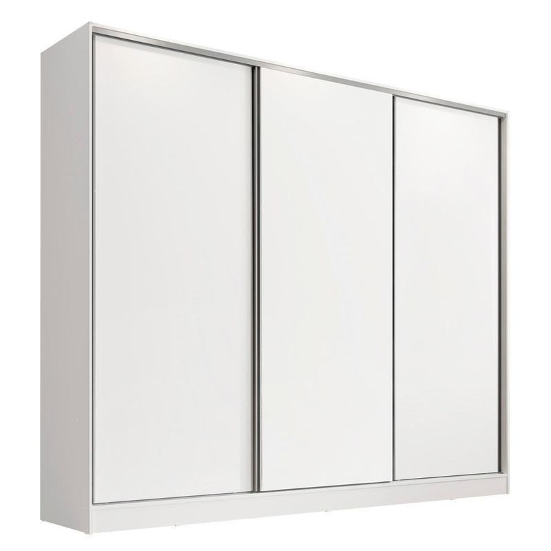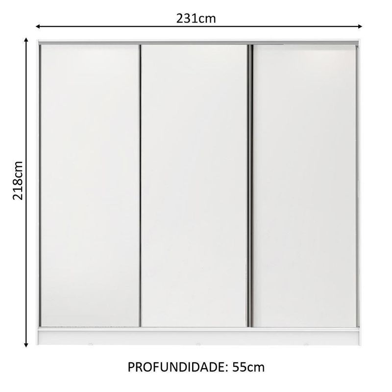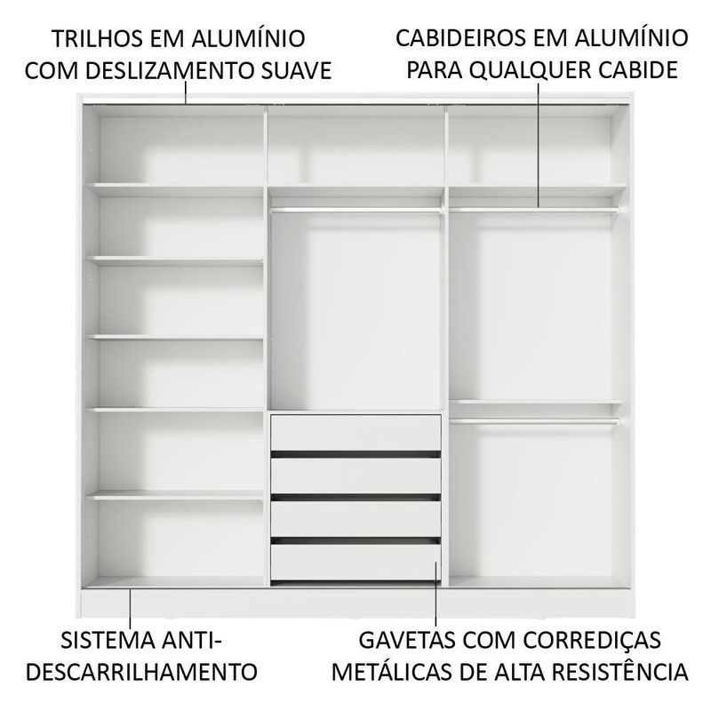 - Itens inclusos: Três (3) cabideiros | Quatro (4) gavetas internas | Oito (8) prateleiras | Três (3) portas de correr com sistema anti-descarrilhamento