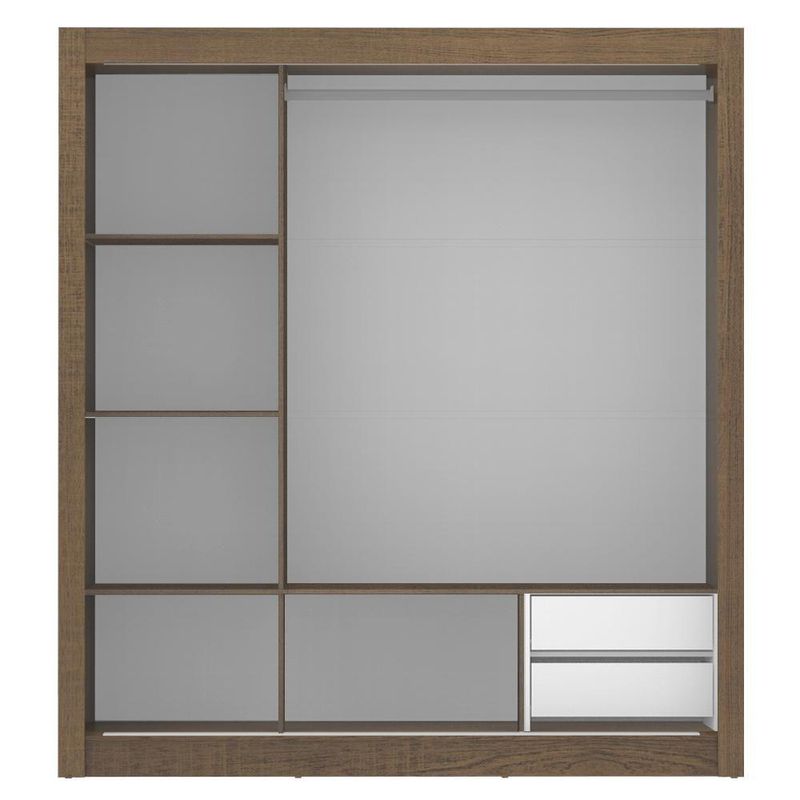 - Estrutura: 3 Prateleiras Totalizando 5 Nichos; 2 Gavetas Internas Brancas; 1 Cabideiro Grande; 3 Portas de Correr (2 de Madeira e 1 com Espelho)