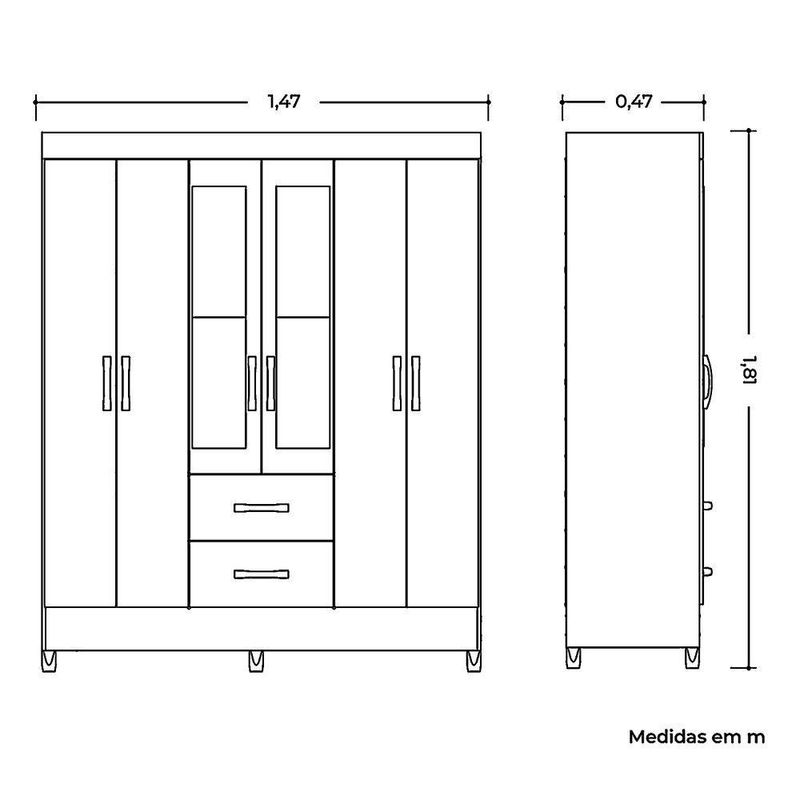 Com design contemporâneo e excelente aproveitamento interno, o Guarda-Roupa Mobi 6 Portas é ideal para quem busca praticidade e organização com estilo.Possui seis portas amplas, dobradiças metálicas resistentes e puxadores em ABS, garantindo durabilidade e um visual moderno.O interior bem distribuído conta com prateleiras espaçosas e cabideiro inteiriço, perfeito para acomodar roupas longas, dobradas e acessórios de forma prática e funcional.O acabamento em pintura UV proporciona brilho e proteção, enquanto os pés em ABS elevam o móvel e trazem estabilidade ao conjunto.Dimensões:Altura: 181 cmLargura: 147 cmProfundidade: 47 cmObservações:- Seis portas com ótimo aproveitamento interno- Cabideiro inteiriço e prateleiras bem distribuídas- Dobradiças metálicas e puxadores em ABS- Estrutura com acabamento UV para maior durabilidade- Pés em ABS que garantem firmeza e um toque de leveza visual