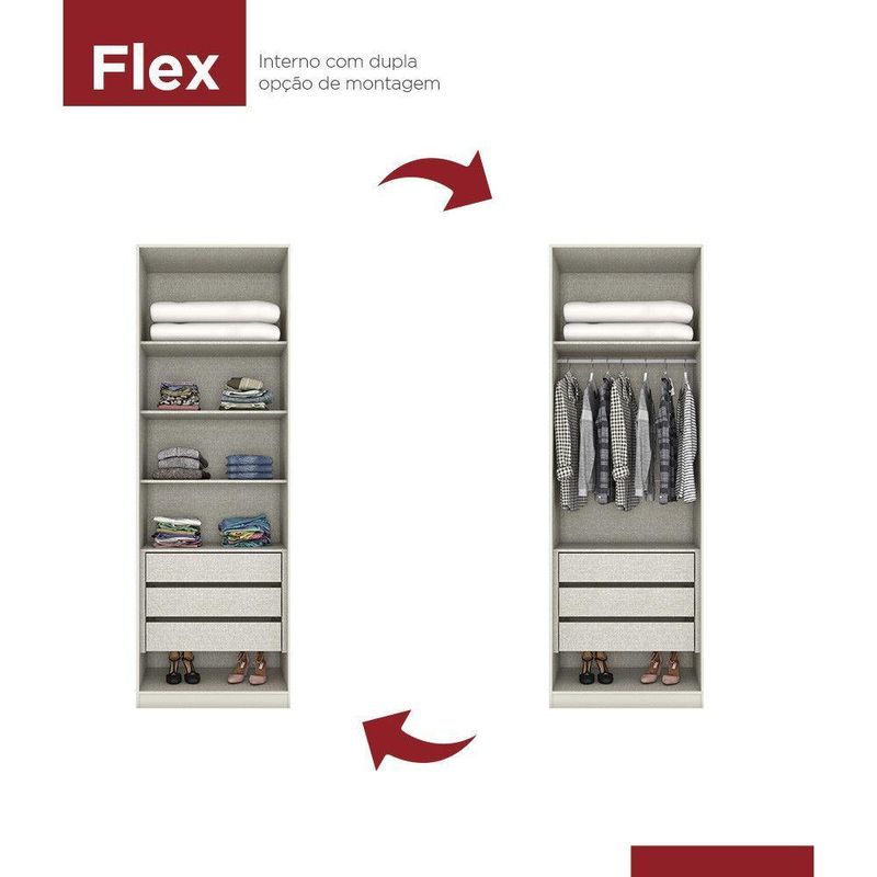 Montagem Flex: Sim, tem duas opções de montagem interna, três gavetas e três prateleiras, e na outra opção três gavetas, um cabideiro e uma prateleira.