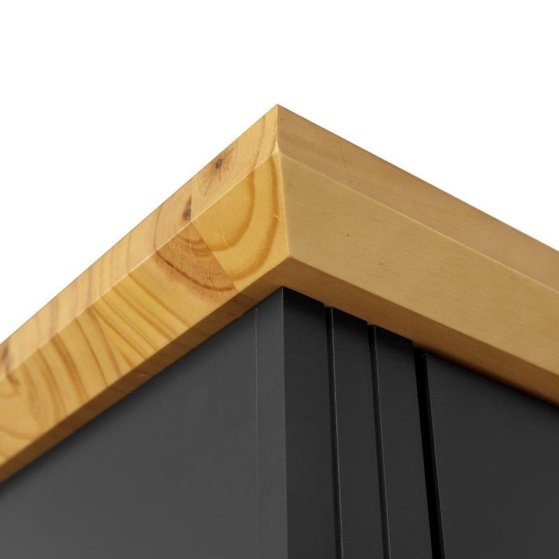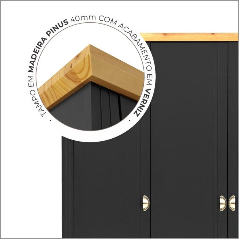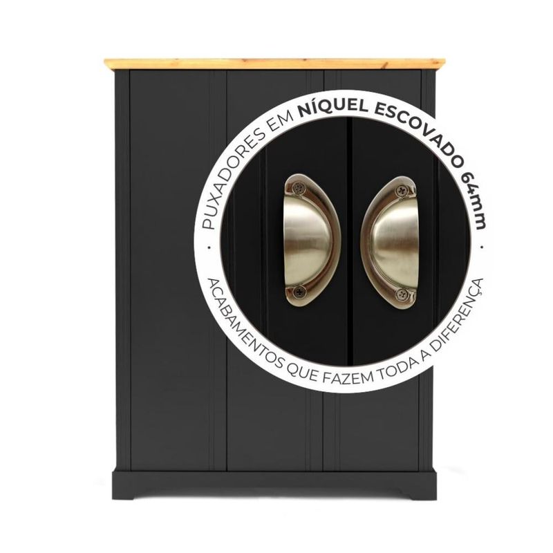 ESPECIFICAÇÕES Numero de Portas: 3; Nichos: 5; Prateleiras internas: 4 (3 Laterais e 1 Superior) Cabideiros: 1 em alumínio; Puxadores: Níquel escovado de 64 mm; Portas: MDF de 15 mm; Acabamento externo: Esmalte Grafite; Estrutura: MDP de 15 mm, fixadas com cavilhas, minifix e parafusos. Tampo: Madeira Pinus de 40 mm com acabamento em verniz;
