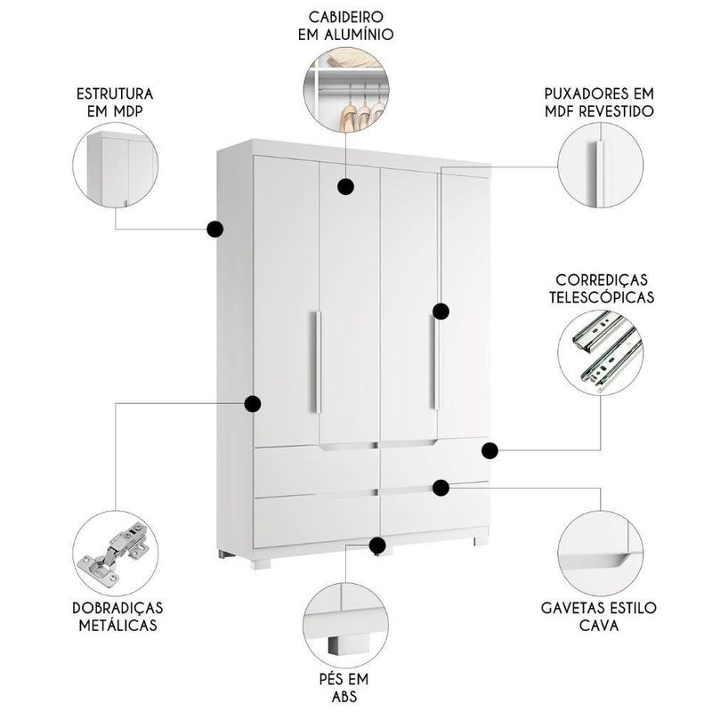 Guarda Roupa Solteiro 160cm 4 Portas Doble Branco - Albatroz