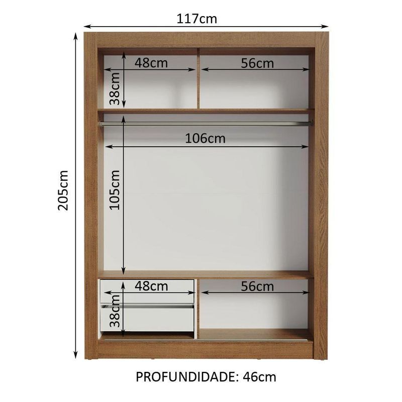 Guarda-roupa Solteiro Dallas 2 Portas de Correr com Espelho 2 Gavetas MadesaGuarda-Roupa com duas portas de correr de deslizamento suave, trilhos em alumínio, dobradiças metálicas e ferragens de qualidade que proporcionam melhor sustentação ao móvel. Contempla duas gavetas com corrediças metálicas, duas prateleiras e três nichos, além de um cabideiro de metal resistente e de tamanho diferenciado, 105 cm.Pensado na medida certa para quarto de solteiro, possui acabamento da estrutura interna e externa em amadeirado Rustic. As portas, costas e gavetas possuem acabamento branco. O processo é feito em pintura poliéster de alta resistência que confere maior qualidade e durabilidade ao produto.Especificações Técnicas: