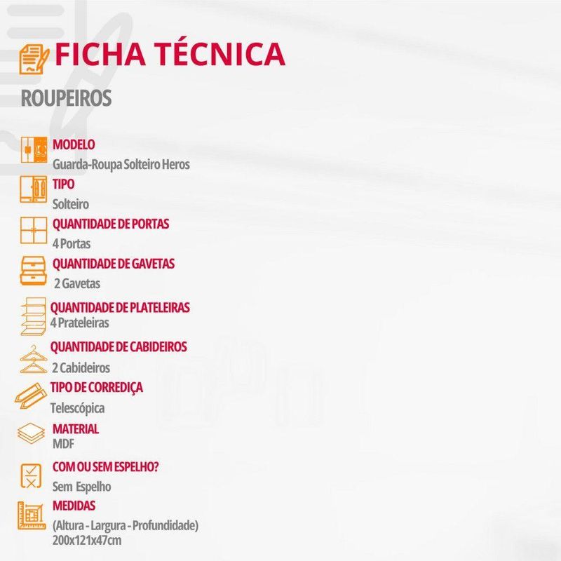 O Guarda-Roupa Heros com 4 portas e a escolha perfeita para quem aprecia um visual classico e elegante. Produzido 100 em MDF, ele combina durabilidade com um design sofisticado. O espaco interno e cuidadosamente dividido, permitindo uma organizacao pratica de suas roupas e objetos. Com 4 portas, 2 gavetas com corredicas telescopicas de facil abertura, dois cabideiros e compartimentos ideais para armazenar calcados, o Heros oferece funcionalidade completa!
