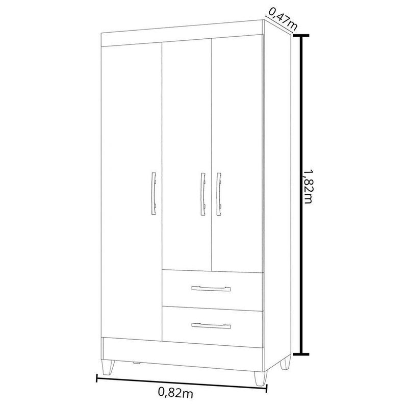 Com design compacto e funcional, o Guarda-Roupa Lima é perfeito para quem busca praticidade sem abrir mão do estilo. Ideal para quartos menores, ele oferece excelente aproveitamento interno e uma organização inteligente, acomodando roupas e acessórios de forma prática e acessível.Seu formato com 3 portas de giro e 2 gavetas proporciona versatilidade e conforto no uso diário. O modelo faz parte da linha Essencial, reconhecida pela leveza visual e pela durabilidade. Os puxadores em tom bronze trazem um toque moderno, enquanto os pés em PVC facilitam a limpeza e garantem estabilidade ao móvel.Dimensões:Altura: 182 cmLargura: 82 cmProfundidade: 47 cmDiferenciais:- 3 portas de giro com dobradiças metálicas resistentes- 2 gavetas com corrediças metálicas de fácil deslizamento- Puxadores em tom bronze, modernos e ergonômicos- Cabideiro interno que otimiza o espaço para roupas longas e curtas- Espaços multifuncionais ideais para organização diária- Pés em PVC que facilitam a limpeza e aumentam a durabilidade- Montagem flexível e estrutura compacta, ideal para diferentes ambientes