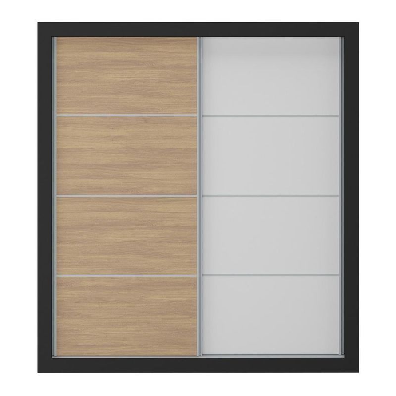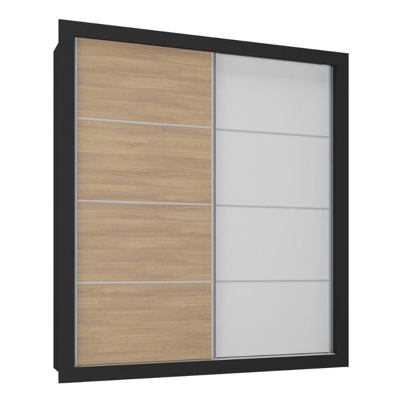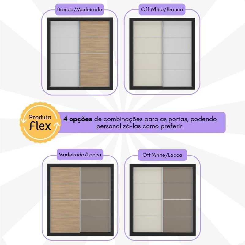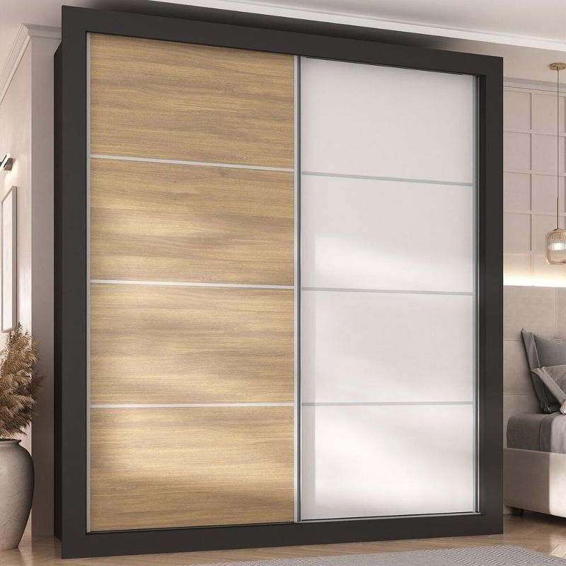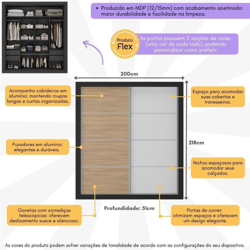 Produzido em MDP (12/15mm) com acabamento acetinado (cerca de 20% de brilho), o guarda-roupas garante resistência e um toque sofisticado. As 2 portas de correr com cores distintas possuem cada lado de 1 cor, permitindo personalizar o móvel entre 4 combinações no momento da montagem, adaptando-o à decoração do seu quarto.