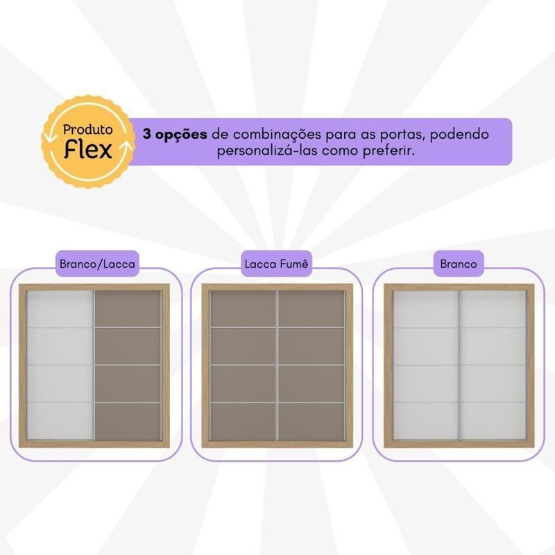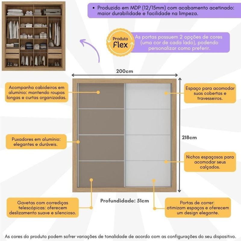 Produzido em MDP (12/15mm) com acabamento acetinado (cerca de 20% de brilho), este guarda-roupas garante resistência e um toque moderno ao ambiente. As 2 portas de correr possuem 2 opções de cores (cada lado de uma cor), permitindo personalizar o móvel entre 3 combinações no momento da montagem, adaptando-o à decoração do seu quarto.