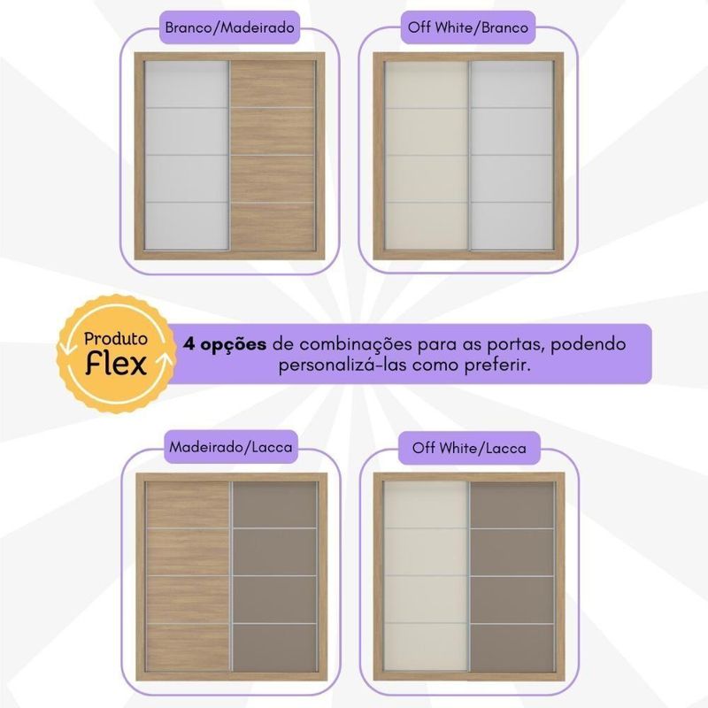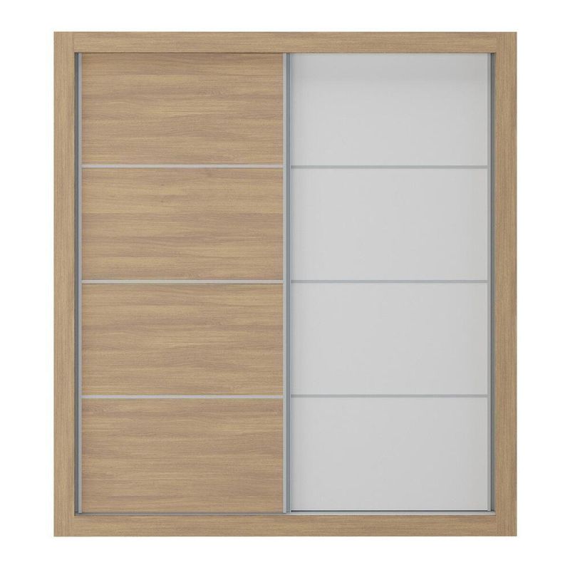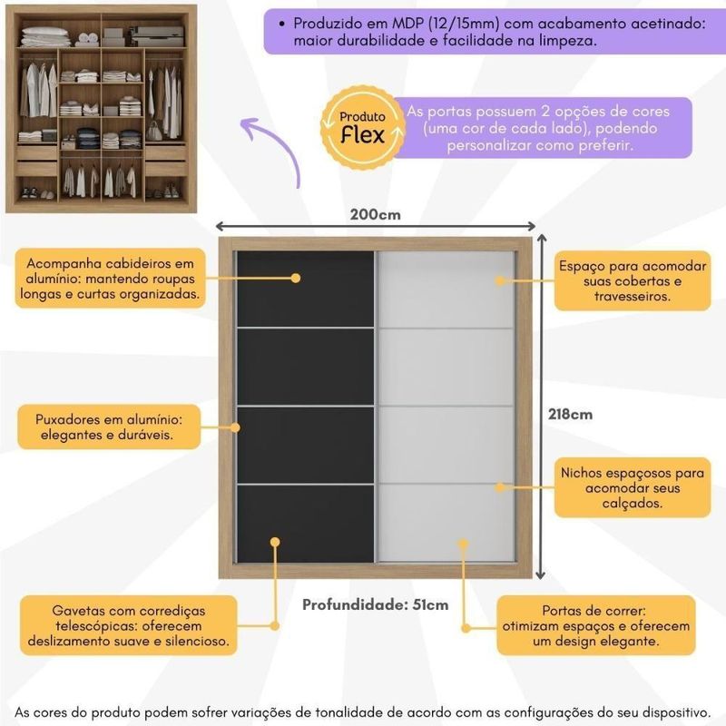 Produzido em MDP (12/15mm) com acabamento acetinado (cerca de 20% de brilho), o guarda-roupas garante resistência e um toque sofisticado. As 2 portas de correr com cores distintas possuem cada lado de 1 cor, permitindo personalizar o móvel entre 4 combinações no momento da montagem, adaptando-o à decoração do seu quarto.