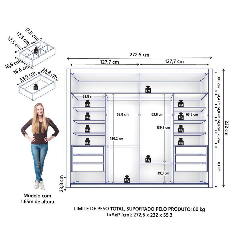 Certifique-se de tudo antes de finalizar a compra, evitando assim futuros desagrados ou imprevistos com a entrega. MEDIDAS:: [ A ] = 232 cm [ L ] = 272,5 cm [ P ] = 55,6 cm | PESO:: 216 kg | PESO SUPORTADO:: 81 kg | GAVETAS SUPORTAM ATÉ:: 3 kg | PRATELEIRAS SUPORTAM ATÉ:: 6 kg | CABIDEIRO SUPORTA ATÉ:: 5 kg | MODELO:: Guarda Roupas Casal 2 Portas de Correr 6 Gavetas Imperador | MARCA:: Zanzini | TIPO DE PINTURA:: Fosco | ACABAMENTO:: Texturizado | MATERIAL:: MDP | ESPESSURA DO MATERIAL:: 15mm | PORTAS:: 2 (Portas de correr) | GAVETAS:: 6 (2 primeiras com divisória) | PRATELEIRAS:: 7 | QUANTIDADE DE CABIDEIRO:: 3 | CABIDEIROS:: Metálicos | CORREDIÇAS:: Telescópicas | PUXADOR:: MDF | GARANTIA:: 3 Meses | DIFERENCIAL:: Duas gavetas com divisórias organizadoras, corrediça telescópicas, porta com amplo espelho. | SISTEMA DE MONTAGEM:: Parafusos auto atarraxantes, cola, cavilhas, pregos, minifix | AVISO:: A Esplanada Móveis se responsabiliza pela entrega dos produtos adquiridos até a porta de entrada ou portaria do endereço indicado, se a portaria do condomínio permitir, as entregas são efetuadas no piso térreo e é de responsabilidade do cliente. | MATERIAIS DA ESTRUTURA: MDP | LARGURA: 272,5 | ALTURA: 232 | PROFUNDIDADE: 55,6 | COR:: Madeirado Cor: Madeir/Off