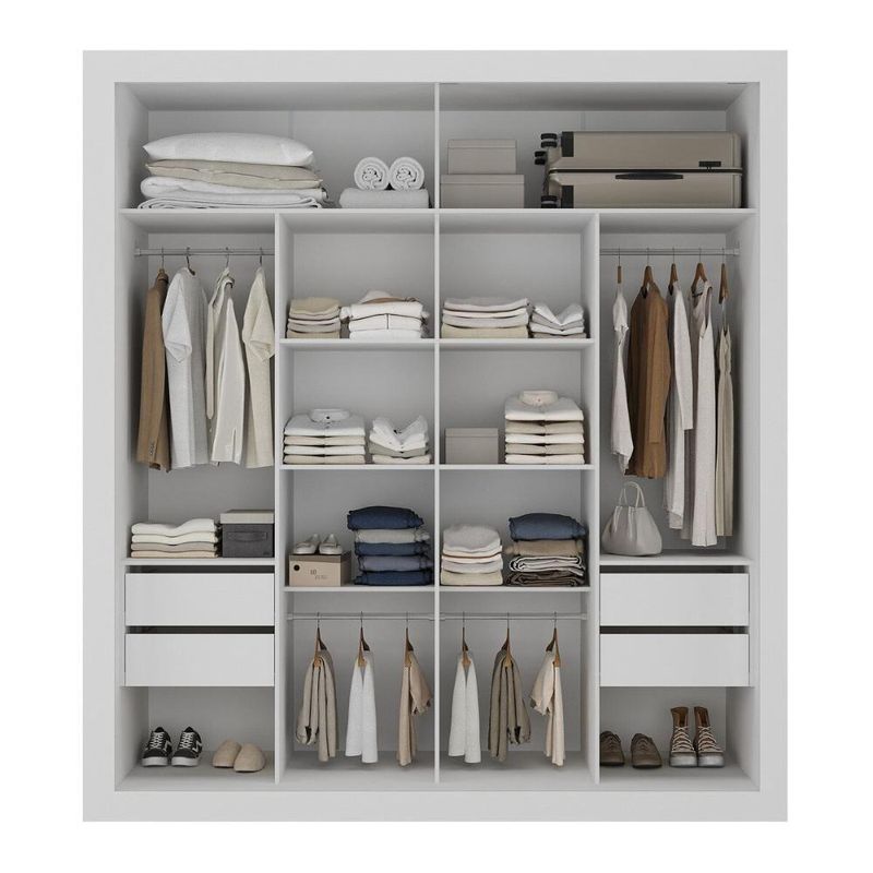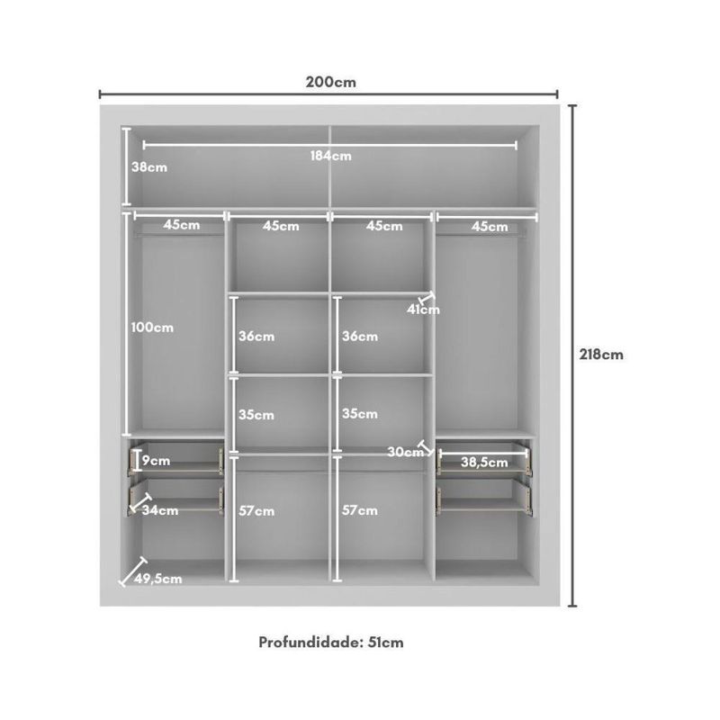 Com 4 gavetas equipadas com corrediças telescópicas, que proporcionam um manuseio suave e silencioso, o modelo oferece amplo espaço para organização. Ambos de alumínio, os puxadores adicionam um toque moderno, enquanto os cabideiros (suportam até 3kg) oferecem a possibilidade de acomodar roupas longas e curtas.