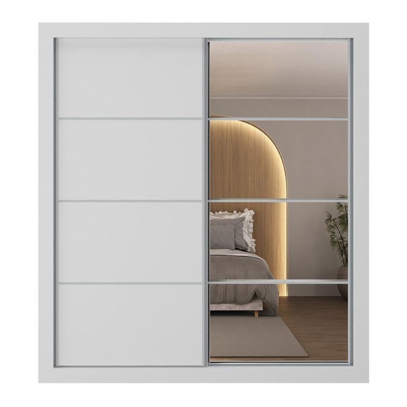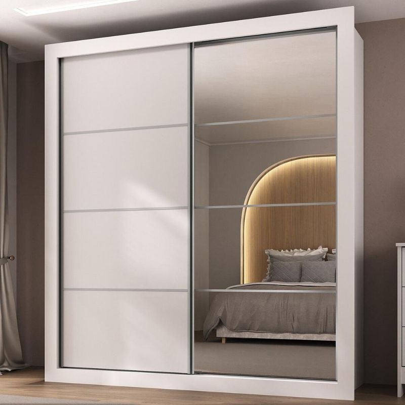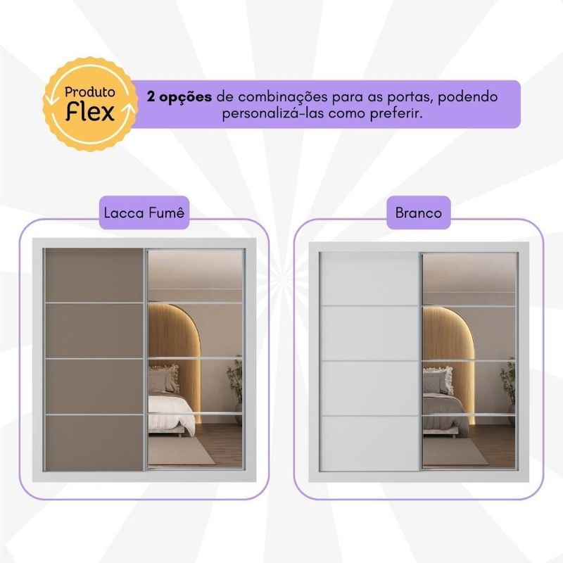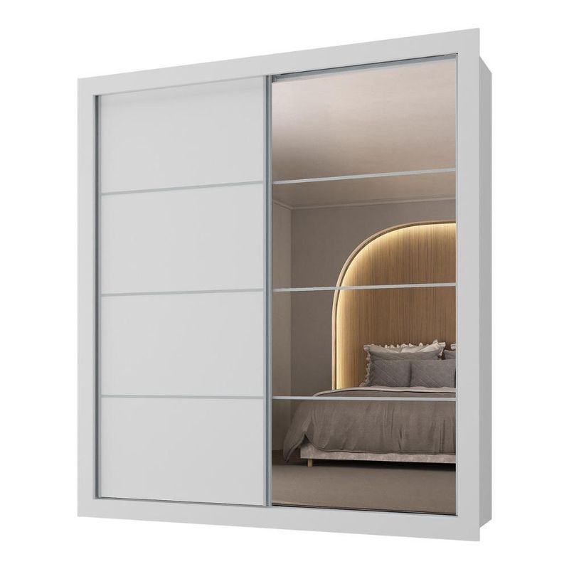 Produzido em MDP (12/15mm) com acabamento acetinado (20% de brilho), este guarda-roupas garante resistência e adiciona um toque de elegância ao seu espaço. Possui 2 portas de correr, sendo 1 delas personalizável, com 1 cor em cada lado, para você escolher a opção que melhor combina com a decoração na hora da montagem. A outra porta, com espelhos de vidro (3mm), amplia o ambiente e oferece uma imagem nítida.