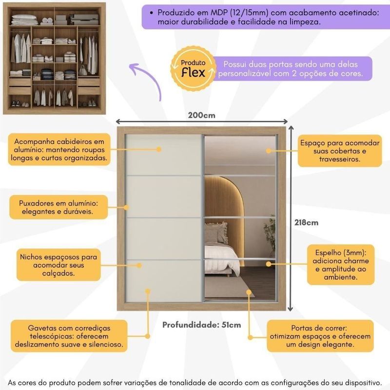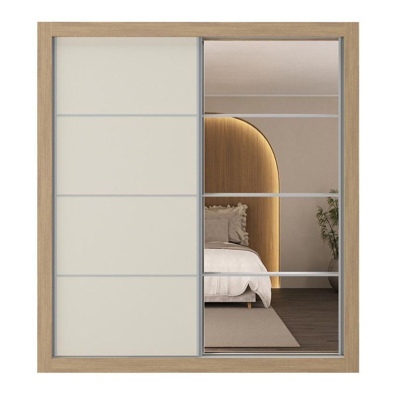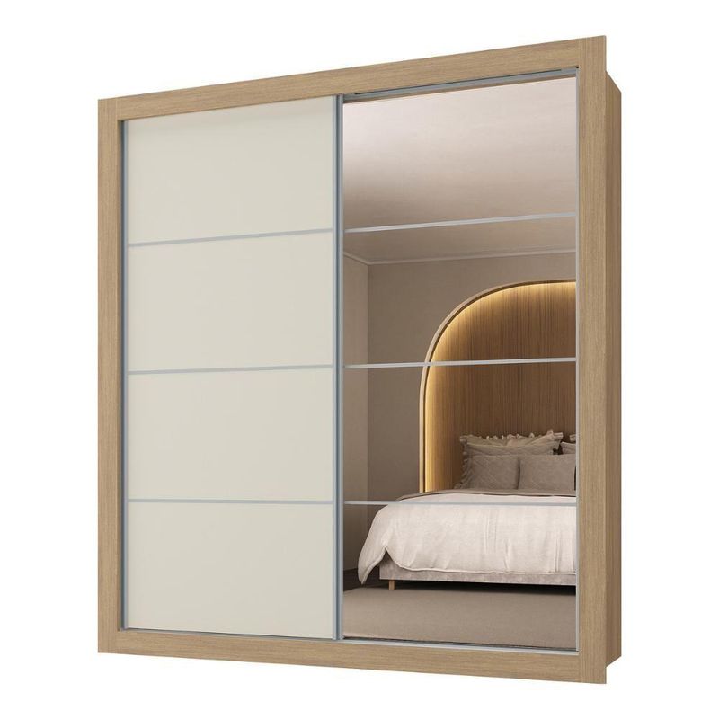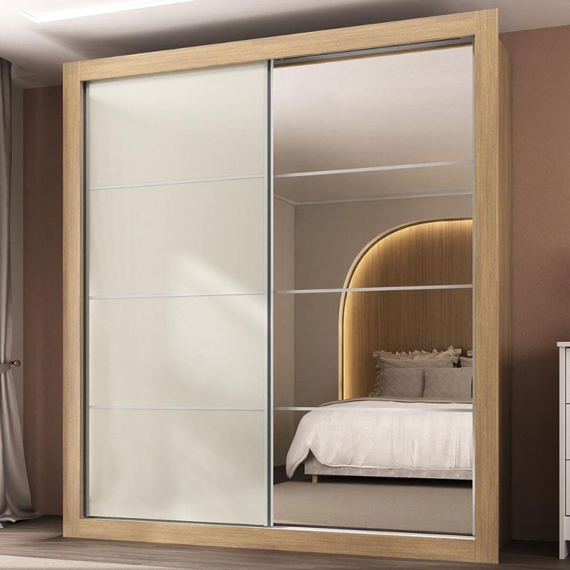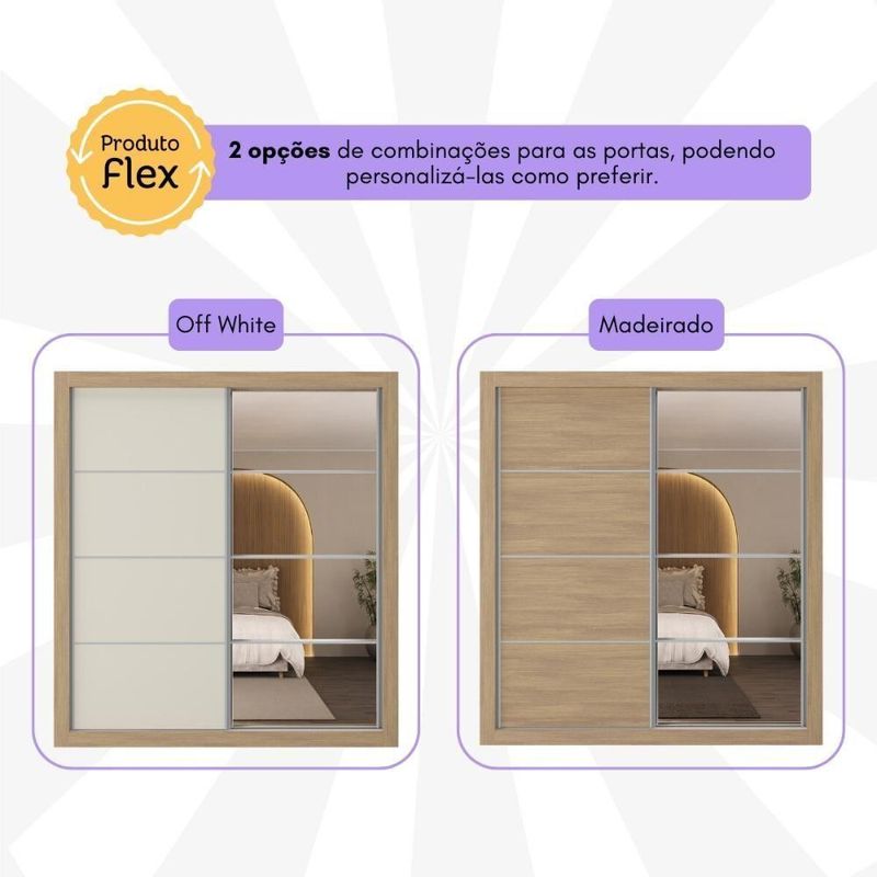 Produzido em MDP (12/15mm) com acabamento acetinado (20% de brilho), este guarda-roupas garante resistência e adiciona um toque de elegância ao seu espaço. Possui 2 portas de correr, sendo 1 delas personalizável, com 1 cor em cada lado, para você escolher a opção que melhor combina com a decoração na hora da montagem. A outra porta, com espelhos de vidro (3mm), amplia o ambiente e oferece uma imagem nítida.