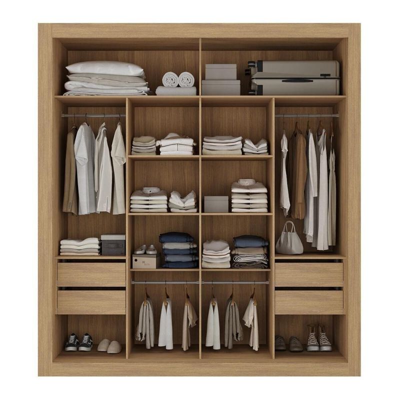 Com 4 gavetas equipadas com corrediças telescópicas, que proporcionam um manuseio suave e silencioso, o modelo oferece amplo espaço para organização. Ambos de alumínio, os puxadores adicionam um toque moderno, enquanto os cabideiros (suportam até 3kg) oferecem a possibilidade de acomodar roupas longas e curtas.