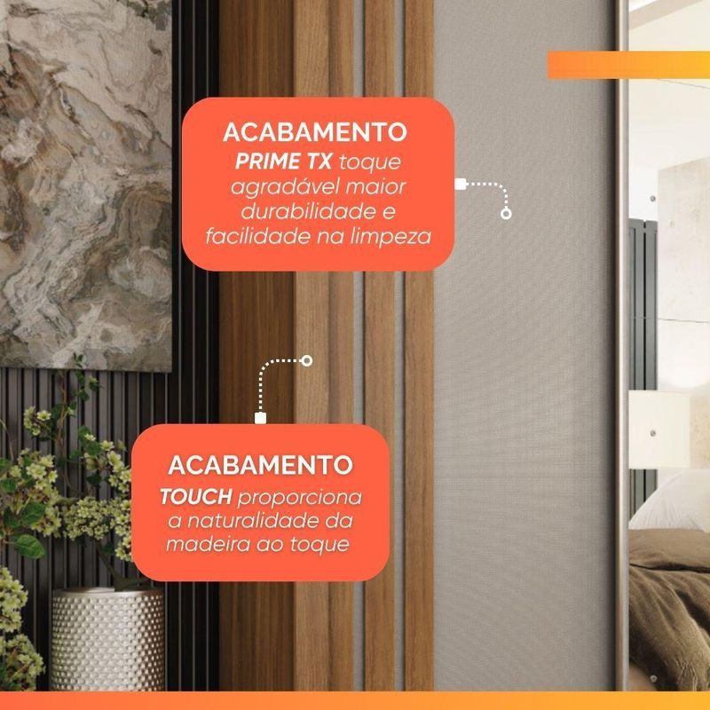 O Guarda Roupas Casal Moema é uma opção moderna e extremamente funcional, ideal para quem deseja praticidade e organização no dia a dia. Suas portas de correr garantem um deslizamento suave e ajudam a otimizar o espaço do ambiente, enquanto o detalhe ripado nas laterais adiciona um toque elegante ao design. Um grande diferencial do modelo é ser flex, permitindo que você escolha a cor das portas no momento da montagem, entre duas opções, para combinar perfeitamente com a decoração do seu quarto. Internamente, o Moema oferece um espaço amplo e muito bem distribuído, com cabideiros para roupas longas e curtas, prateleiras espaçosas e gavetas internas que facilitam a organização. O espelho central traz ainda mais praticidade e amplia visualmente o ambiente. Com acabamento touch + prime e visual sofisticado, o Guarda Roupas Moema é a escolha perfeita para quem busca beleza, qualidade e ótimo aproveitamento de espaço.