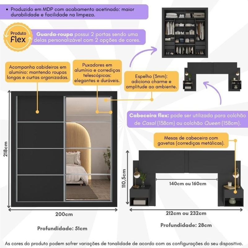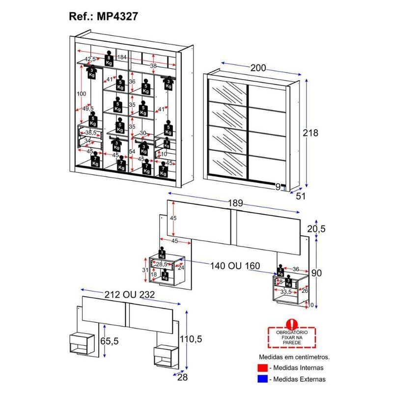 Renove o seu quarto com o conjunto perfeito de Guarda-Roupas Casal Espelho e Cabeceira com 2 Mesas de Cabeceira Multimóveis MP4327, que une funcionalidade e design.Personalização e durabilidade: Produzido em MDP (12/15mm) com acabamento acetinado (cerca de 20% de brilho), este conjunto garante resistência e facilidade na limpeza. A cabeceira ajustável pode ser utilizada com colchões de Casal (138cm) ou Queen (158cm), adaptando-se harmoniosamente a qualquer estilo decorativo.Praticidade e funcionalidade: As mesas de cabeceira acopladas são um destaque de funcionalidade, com nichos e gavetas com corrediças metálicas, que oferecem uma abertura suave. Organize e tenha seus itens sempre por perto, com charme e eficiência. O guarda-roupas possui 2 portas de correr, sendo 1 delas personalizável com 2 opções de cores (cada lado de uma cor), enquanto a outra conta com espelhos de vidro (3mm) lapidados (não possuem bordas cortantes), oferecendo a ideia de amplitude ao ambiente e segurança no manuseio. As 4 gavetas do guarda-roupa são equipadas com corrediças telescópicas, permitindo sua abertura total e um manuseio silencioso.Amplo espaço interno e sofisticação: O guarda-roupas também possui puxadores de alumínio elegantes, cabideiros (até 3 kg) para roupas longas e curtas, nichos generosos para roupas e calçados, além de um espaço superior pensado para cobertores e travesseiros, completando o seu quarto da melhor forma possível.Conteúdo da Embalagem: