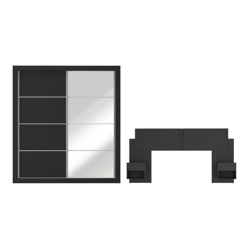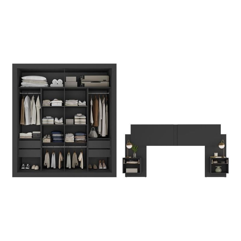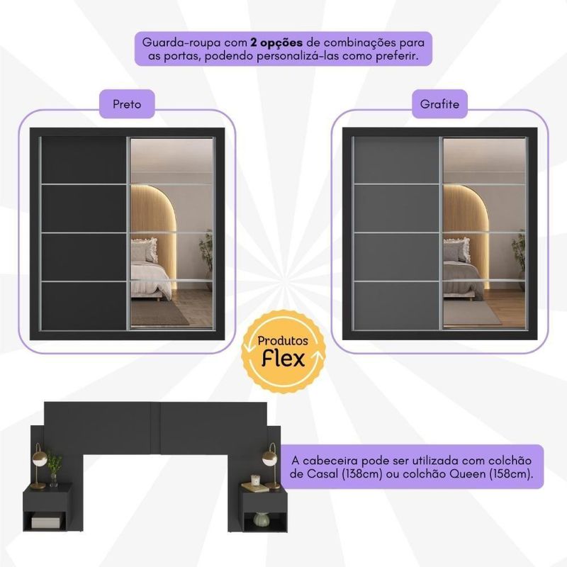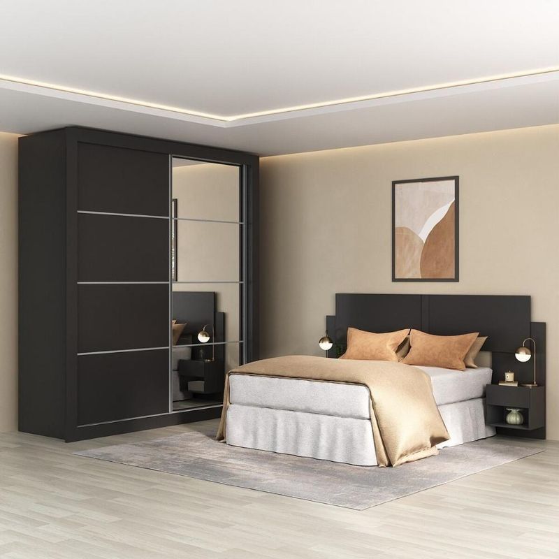 Guarda Roupas Casal Espelho E Cabeceira Com 2 Mesas De Cabeceira Multimóveis MP4327 Preto