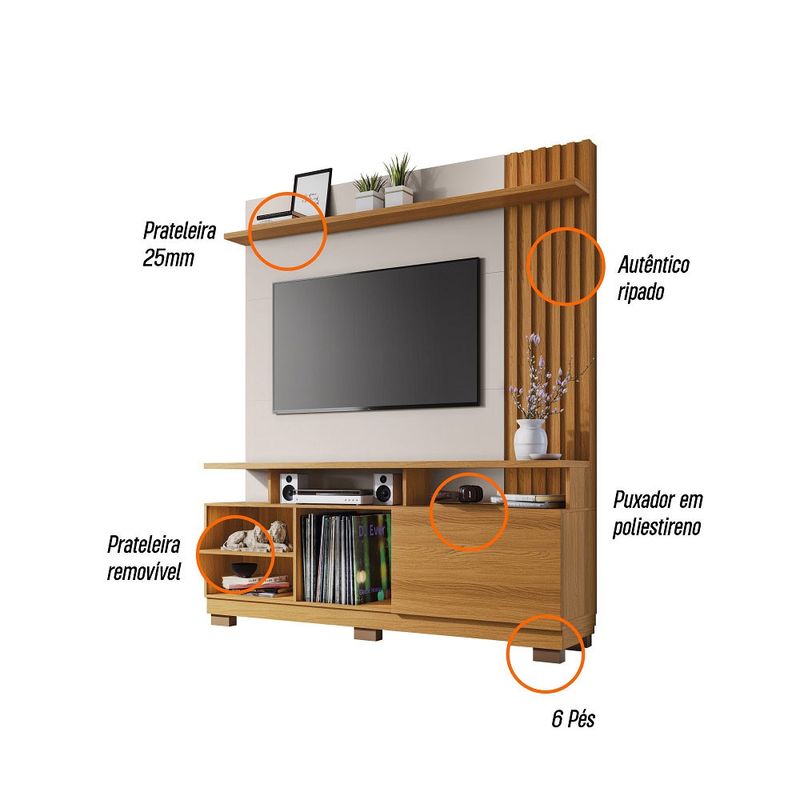 Além disso, conta com detalhe ripado, porta basculante com pistão á gás e prateleira inferior removível oferecendo amplo espaço para guardar seus eletrônicos, livros e outros. A porta central basculante, com pistão a gás, é uma facilidade que proporciona mais comodidade para abrir e fechar, conta também com prateleira superior em MDP 25mm comportando suas decorações prediletas.