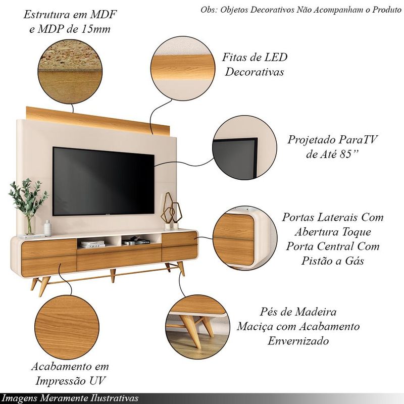 O Home Theater Decorativo Nobre é um móvel sofisticado e funcional, ideal para TVs de até 85 polegadas. Seu design conta com cantos arredondados e iluminação LED integrada, que destaca a decoração do ambiente. As portas laterais possuem sistema de abertura fecho toque, proporcionando um visual moderno e prático. A porta central conta com dobradiças metálicas e pistão a gás para um fechamento suave. Os filetes decorativos dourados e os pés de madeira maciça torneados com acabamento envernizado adicionam elegância ao móvel. Produzido em MDP e MDF de 15mm, é a escolha perfeita para quem busca um móvel que combine funcionalidade, estilo e qualidade. Com amplo espaço e estrutura robusta, oferece suporte para TVs de até 85” e ainda otimiza seu ambiente com beleza e praticidade. Dimensões do Produto: