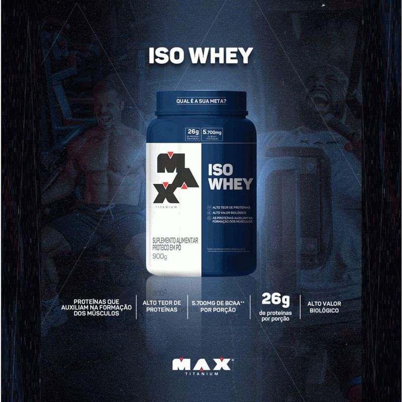 ISO WHEY (900g) - MAX TITANIUM Iso Whey Max é composto unicamente de Whey Protein Isolada, sendo uma proteína de altíssimo valor biológico. Cada porção equivale a 49g de proteína puríssima, com zero teor de carboidratos, lactose ou qualquer tipo de gordura (sem gordura). A Proteína é o nutriente mais importante na construção do músculo e não há como obter resultados esmagadores sem sua ingestão. No mercado existem diversos tipos de proteínas que são de acordo com seu VB (valor biológico) que determinam a disponibilidade para utilização do nosso corpo. Atualmente a melhor proteína (com maior VB) é a proteína isolada do soro do leite. A proteína isolada do soro do leite possui cadeias curtas e peptídeos que promovem uma absorção rápida (cerca de 10 minutos após a ingestão). Após o treino, seu corpo tem a necessidade de ingestão de proteínas para que possa se recuperar da atividade física. As células são sedentas por proteínas e precisam absorver nutrientes para que possam promover a recuperação muscular. Quanto mais rápido puderem absorver nutrientes, melhor. Inserido neste cenário, ISO Whey Max oferece a proteína de rápida absorção e de alto valor biológico, nutrindo as células e garantindo a recuperação muscular e o desenvolvimento máximo de massa magra. Por ser livre de lactose, o Iso Whey Max também pode ser consumido por pessoas com intolerância à lactose. Os ganhos financeiros com Iso Whey Max são, sem sombra de dúvida, muito maiores em relação às proteínas comuns. BENEFÍCIOS:* 100% Whey Protein Isolado (WPI);* 25g de proteína por porção;* 5,2 de BCAA por porção;* Fonte de Vitaminas e Minerais;