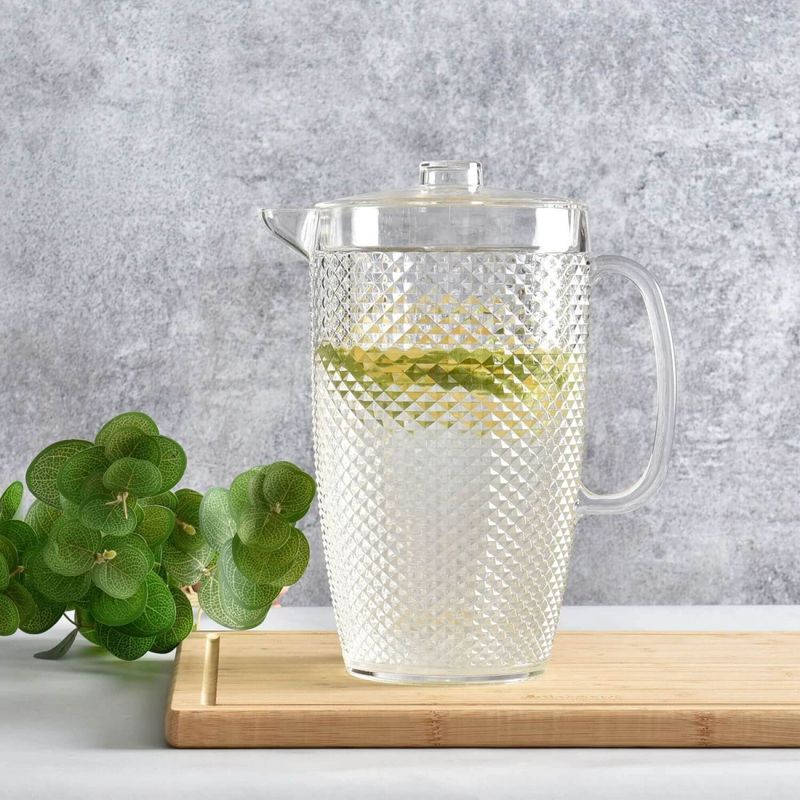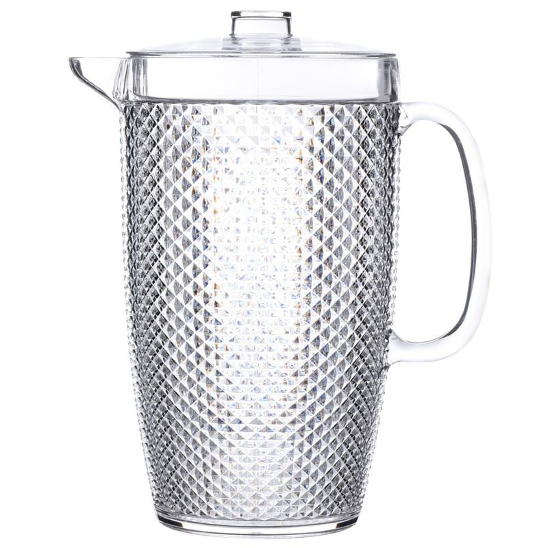 Fabricada em acrílico pela brasileira Kenya, a jarra da linha diamond, possui design diferenciado tridimensional em alto relevo, proporcionando um efeito lindo à mesa e combinando perfeitamente com os copos da mesma linha. Produtos em acrílico são ótimas opções para reuniões familiares e eventos ao ar livre, sua resistência torna esse item a melhor opção.